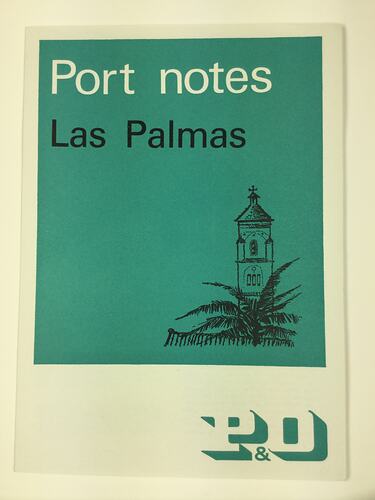 Booklet given to passengers while on board the SS Arcadia detailing information about Las Palmas on the local history, interesting landmarks, local customs and basic maps. The booklet was collected by Beryl Adams while on board the SS Arcadia. Beryl Adams came to Australia as an assisted migrant from England on the Orient Line SS Oronsay in 1959. She then travelled back to England to visit family in 1967 on the SS Arcadia, and returned to Australia in 1968 on the SS Oriana.