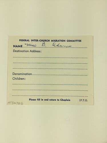Card issued to passengers to assist them with migrating to a new congregation. This card was collected by Beryl Adams while on board the SS Arcadia. Beryl Adams came to Australia as an assisted migrant from England on the Orient Line SS Oronsay in 1959. She then travelled back to England to visit family in 1967 on the SS Arcadia, and returned to Australia in 1968 on the SS Oriana.