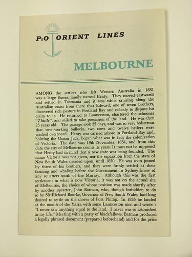 Booklet given to passengers with general information about landmarks, hotels and dining options in Melbourne. This was collected by Beryl Adams while on-board the SS Arcadia. Beryl Adams migrated to Australia as a ten pound pom on the SS Oronsay in 1959, and then travelled back to England to visit family in 1967 on the SS Arcadia, returning to Australia in 1968 on the SS Oriana.