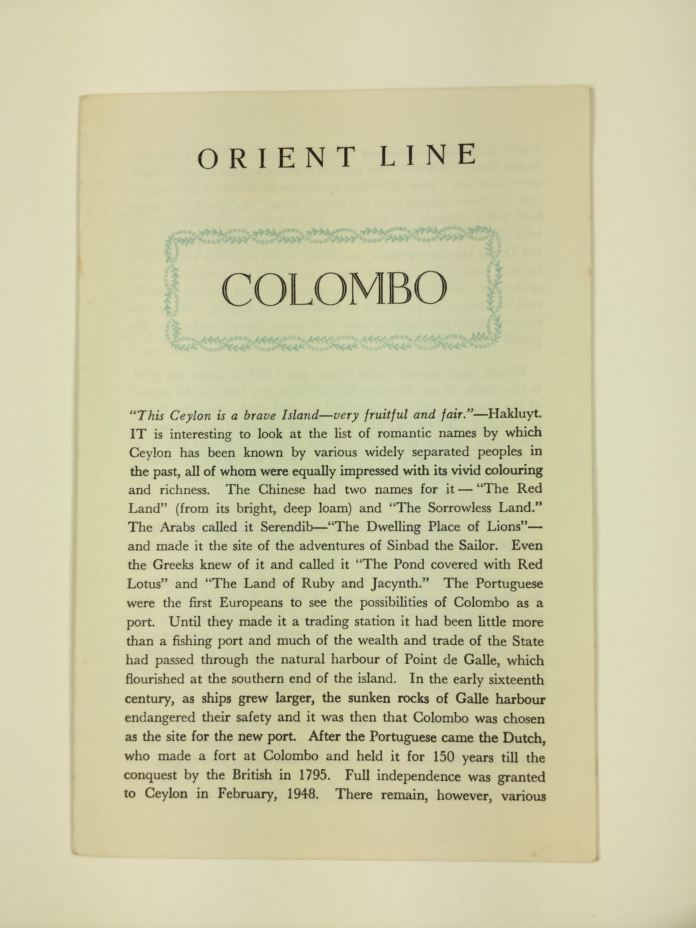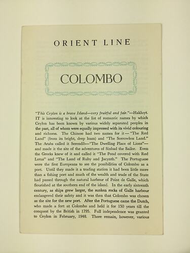 Booklet given to passengers with general information about landmarks, hotels and dining options in Colombo. This was collected by Beryl Adams while on-board the SS Arcadia. Beryl Adams came to Australia as an assisted migrant from England on the Orient Line SS Oronsay in 1959. She then travelled back to England to visit family in 1967 on the SS Arcadia, and returned to Australia in 1968 on the SS Oriana.