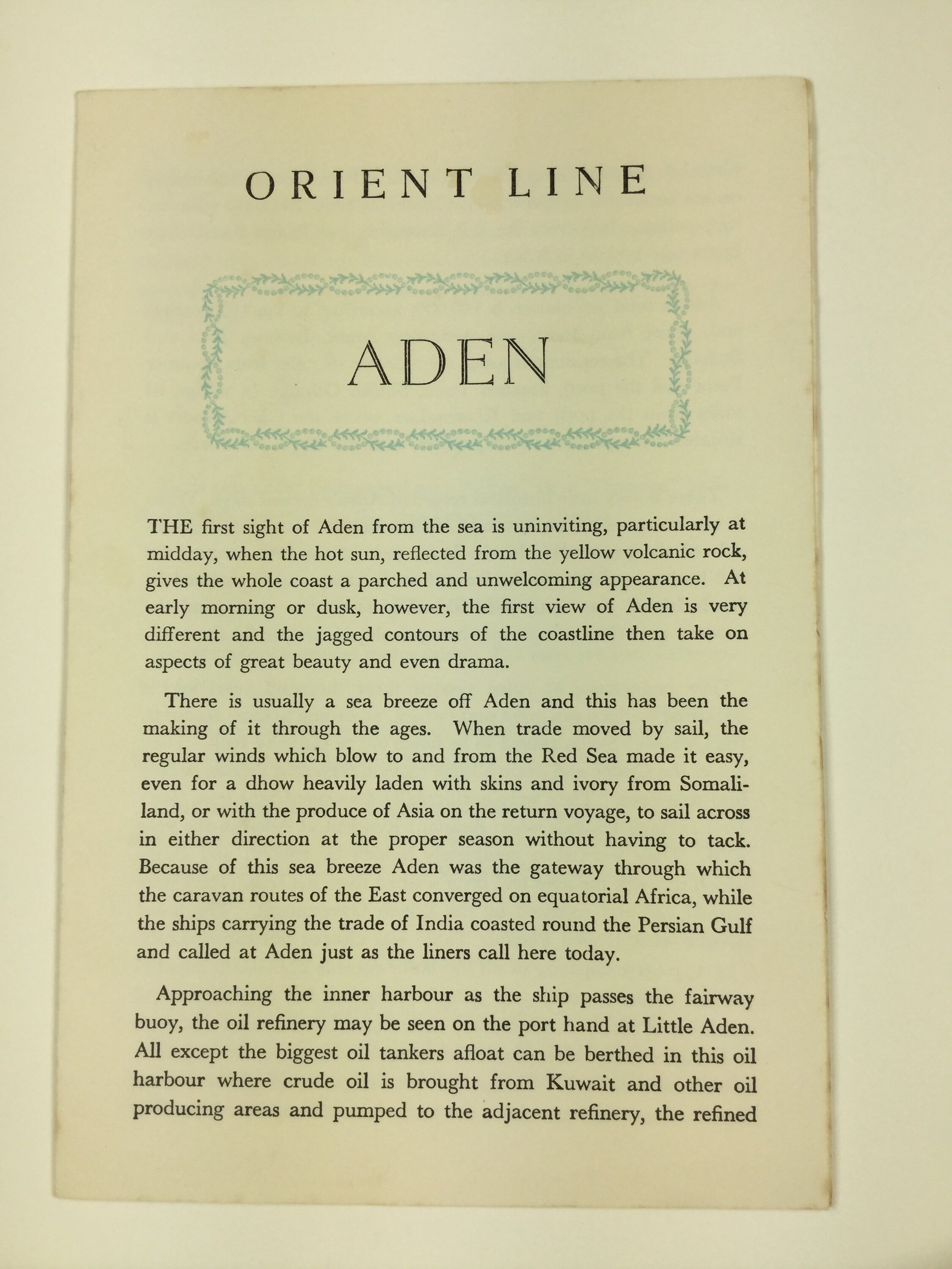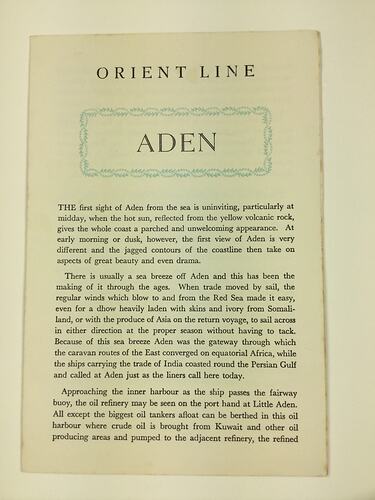 Booklet given to passengers with general information about landmarks, hotels and dining options in Aden. This was collected by Beryl Adams while on-board the SS Arcadia. Beryl Adams came to Australia as an assisted migrant from England on the Orient Line SS Oronsay in 1959. She then travelled back to England to visit family in 1967 on the SS Arcadia, and returned to Australia in 1968 on the SS Oriana.