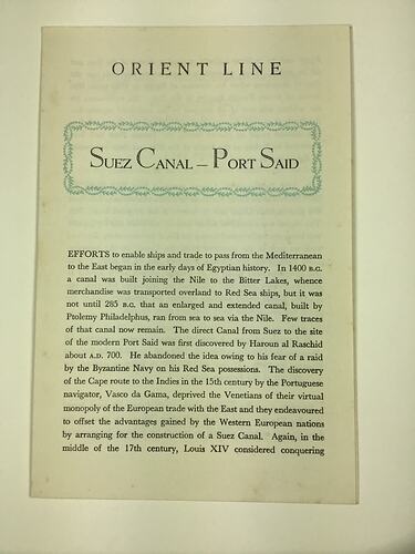 Booklet given to passengers with general information about landmarks, hotels and dining options in the Suez Canal and Port Said. This was collected by Beryl Adams while on-board the SS Arcadia. Beryl Adams came to Australia as an assisted migrant from England on the Orient Line SS Oronsay in 1959. She then travelled back to England to visit family in 1967 on the SS Arcadia, and returned to Australia in 1968 on the SS Oriana.