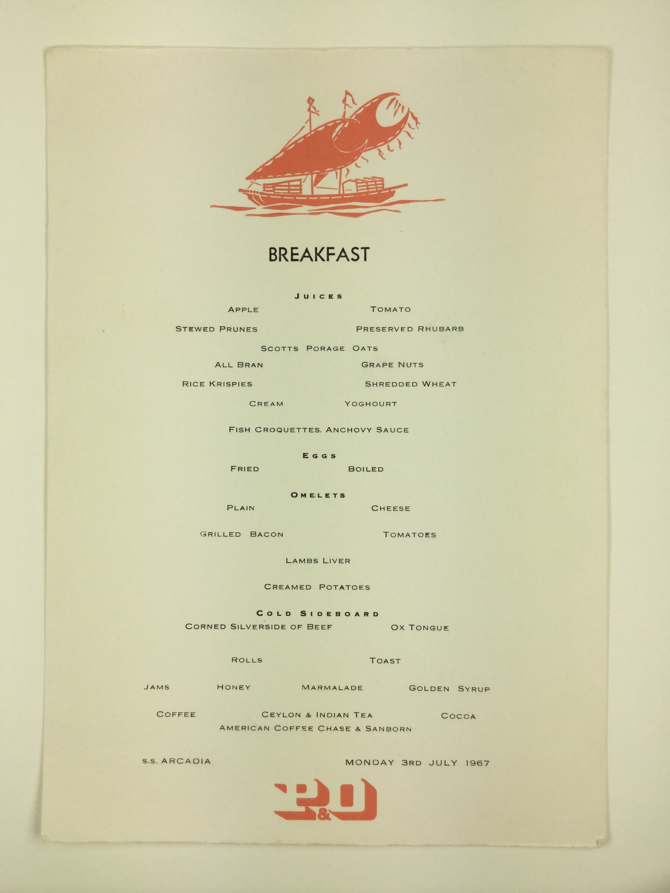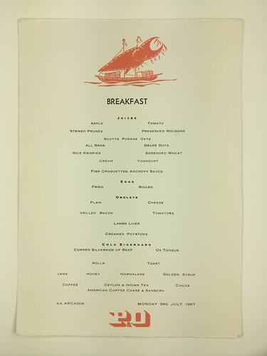 Menu detailing the options available for breakfast on-board the SS Arcadia on 3 July 1967. The menu was collected by Beryl Adams while on-board the SS Arcadia. Beryl Adams came to Australia as an assisted migrant from England on the Orient Line SS Oronsay in 1959. She then travelled back to England to visit family in 1967 on the SS Arcadia, and returned to Australia in 1968 on the SS Oriana.
