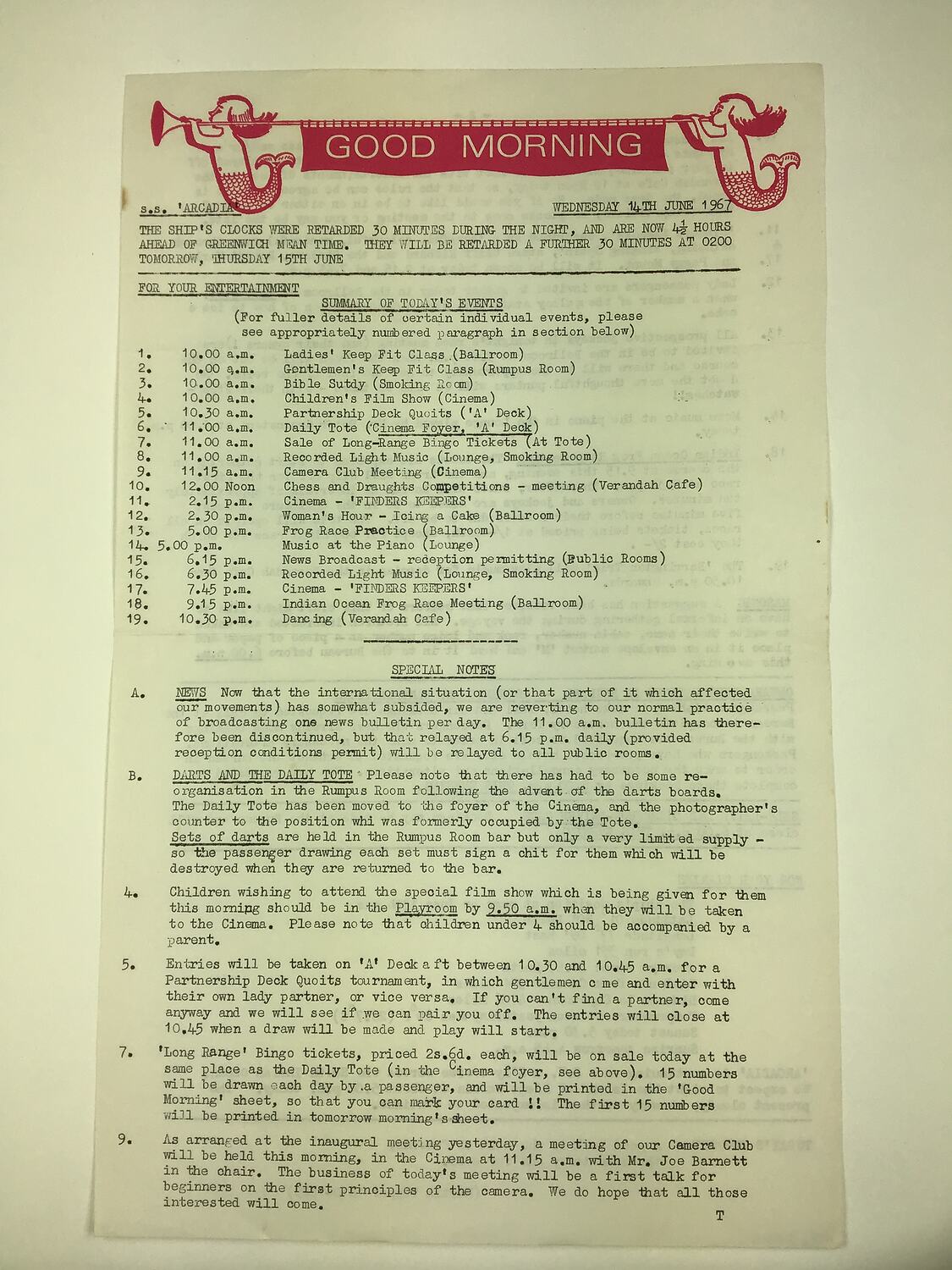 Newsletter titled 'Good Morning' issued to passengers on the SS Arcadia on 14 June 1967. The newsletter details daily events, useful ship based information, instructions for booking port tours, and a thought for the day. The newsletter was collected by Beryl Adams while on-board the SS Arcadia. Beryl Adams came to Australia as an assisted migrant from England on the Orient Line SS Oronsay in 1959. She then travelled back to England to visit family in 1967 on the SS Arcadia, and returned to Australia in 1968 on the SS Oriana.