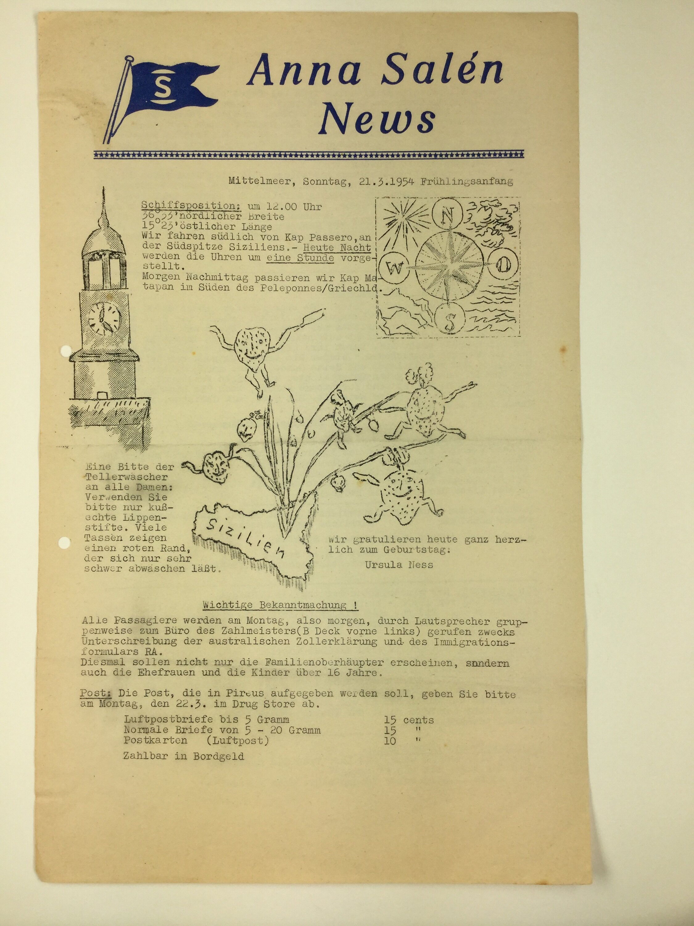 This newsletter is one of a collection of 28 newsletters from the German passenger ship the 'Anna Salen' which are in an almost complete run from 13 March to 15 April 1954 (issues 14 March, 23, March, 4 April and 11 April are either missing or were not produced). Each issue consists of one typed, double-sided sheet, and a single frontice sheet for the collection was also produced, entitled: 'Anna Salen News' March-April 1954'.