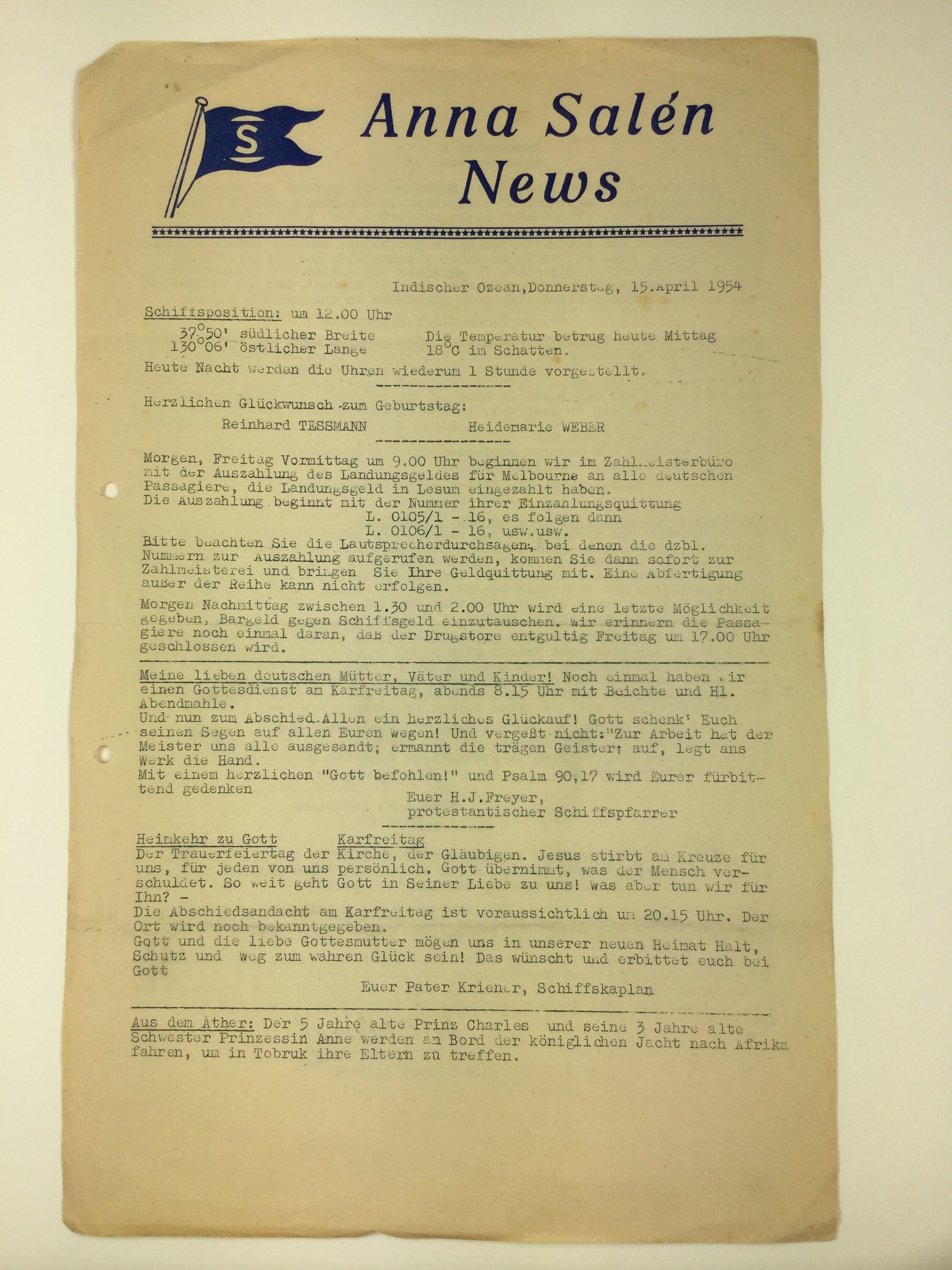 This newsletter is one of a collection of 28 newsletters from the German passenger ship the 'Anna Salen' which are in an almost complete run from 13 March to 15 April 1954 (issues 14 March, 23, March, 4 April and 11 April are either missing or were not produced). Each issue consists of one typed, double-sided sheet, and a single frontice sheet for the collection was also produced, entitled: 'Anna Salen News' March-April 1954'.