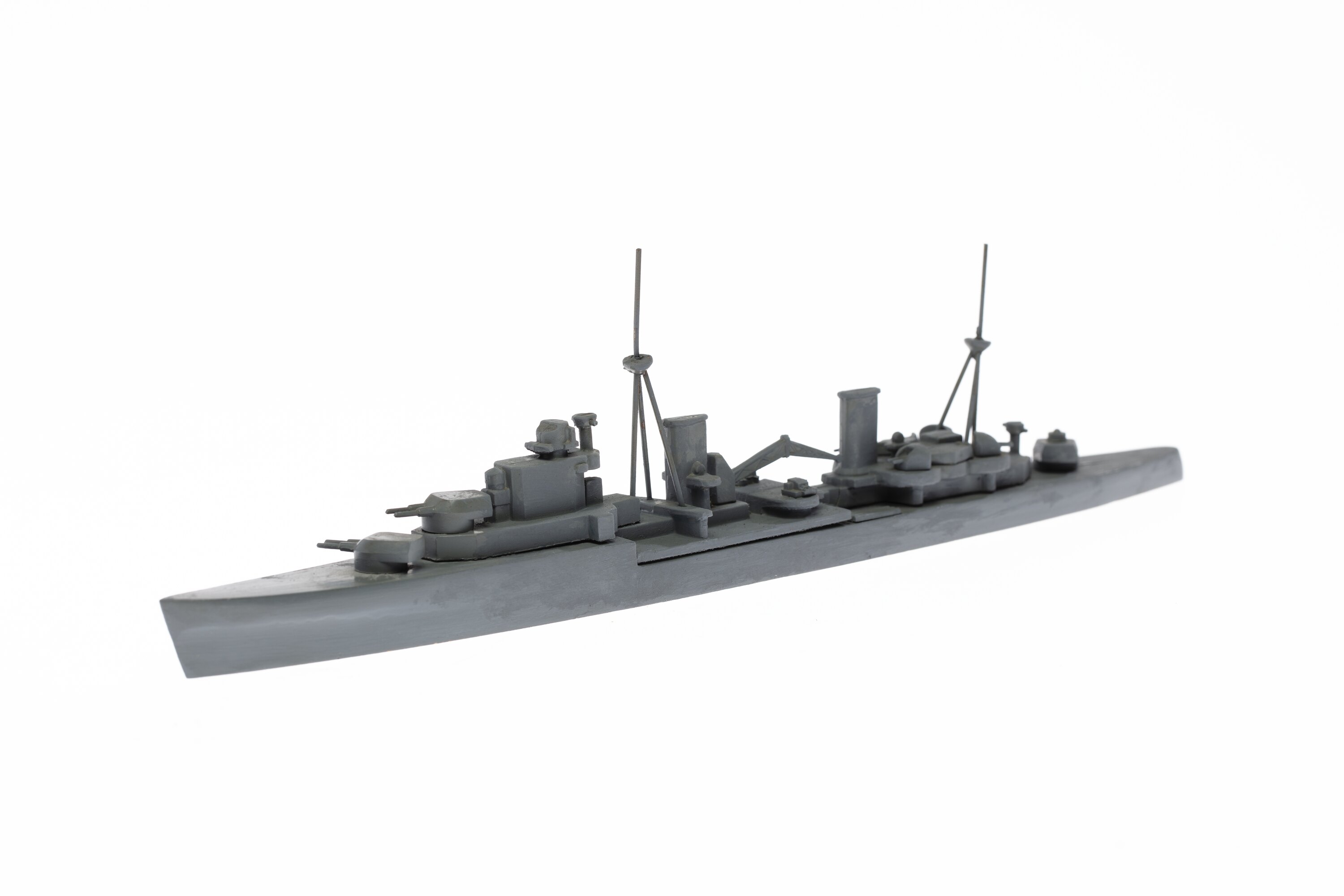 Grey painted waterline ship model on base board. Model screwed onto base. Indentification inscription underneath.
