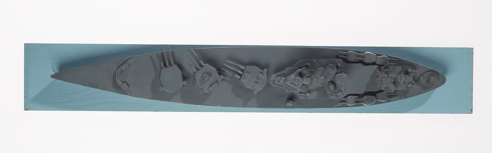 Grey painted waterline ship model on base board. Model screwed onto base. Indentification inscription underneath.