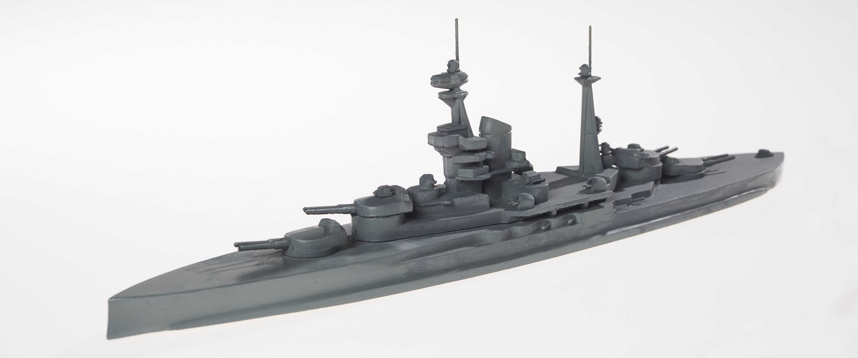 Grey painted waterline ship model on base board. Model screwed onto base. Indentification inscription underneath.