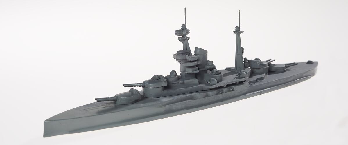 Waterline model of British and Commonwealth Navy ship was made by Renown in Britain and H.A Framburg of Chicago, USA. Used for ship recognition training during World War II. Folding case is dated '12.4.1943'.