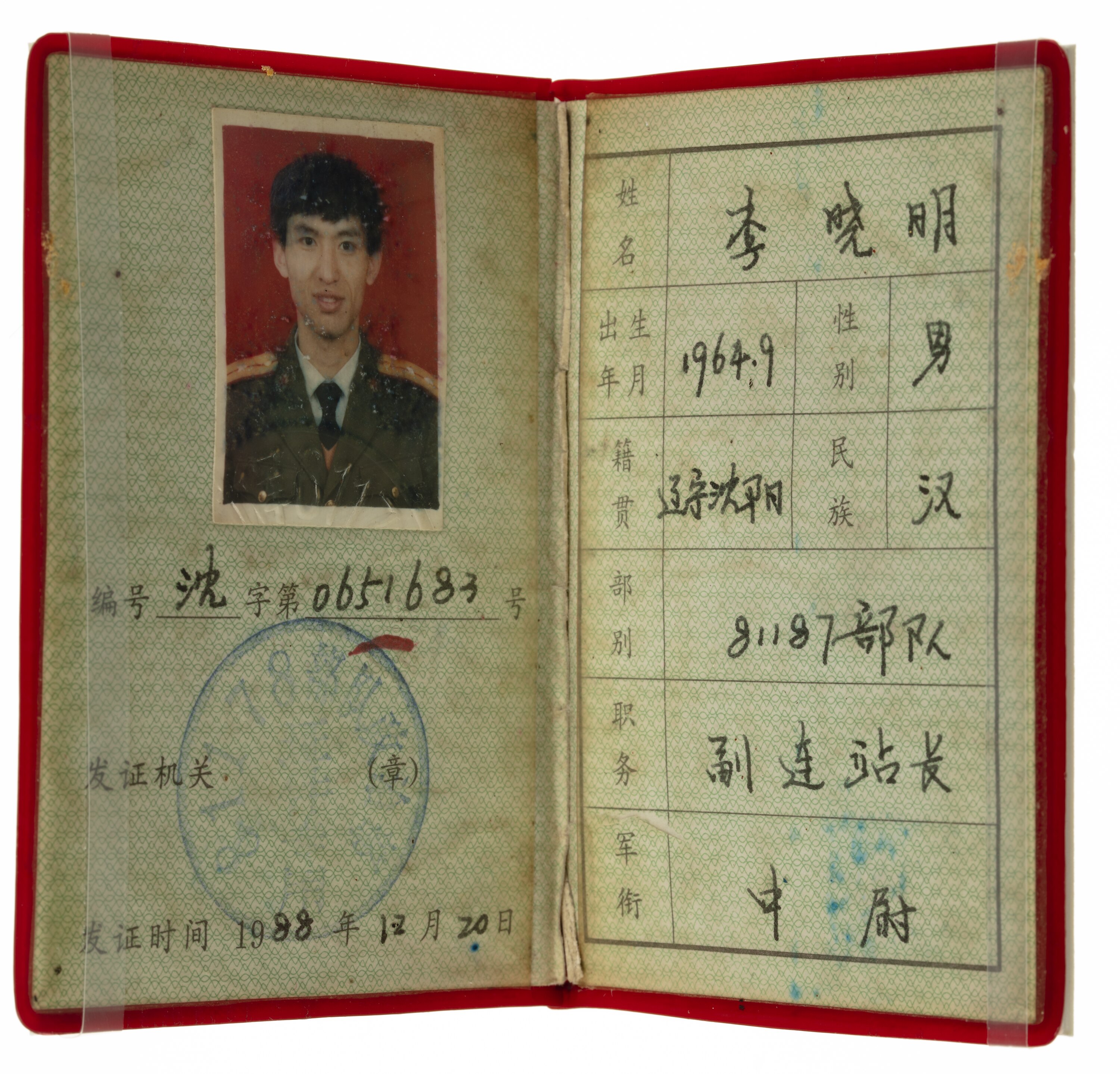 Red plastic cover with gold script embossed on front, inside green printed paper with colour photo of a man in uniform, a stamp and script in Chinese.