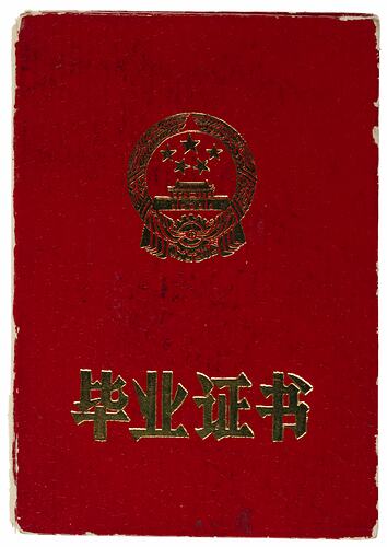 Academic certificate for a Bachelor Degree in Radar Technology, awarded to Li Xiaoming (Thomas) in 1987. Thomas formally migrated to Australia in 2002. The booklet contains a black and white photographic head portrait of Thomas in uniform and Chinese script.