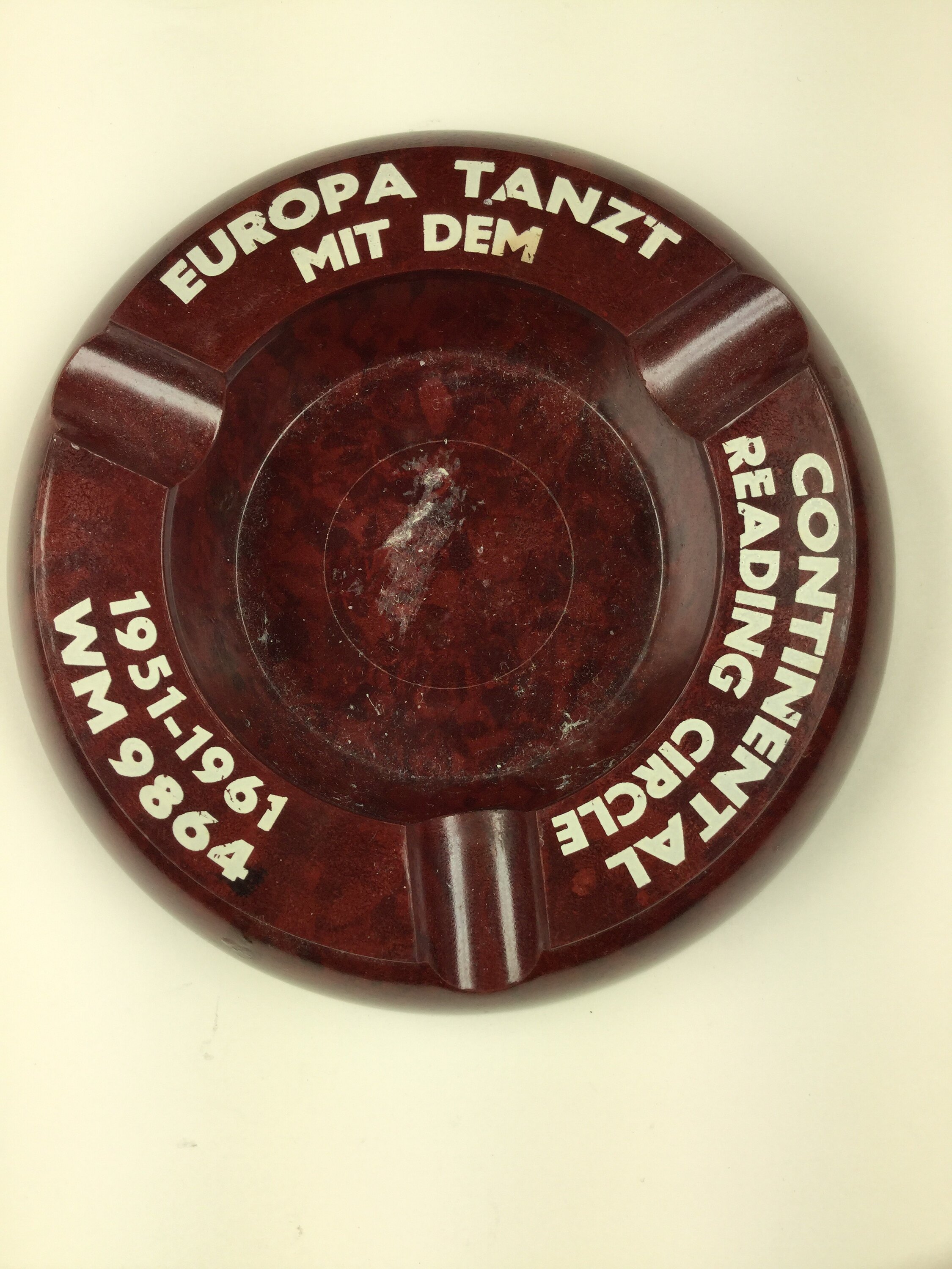 Bakelite ashtray inscribed with 'Continental Reading Circle 1951-1961' and text in German language. It is a souvenir relating to an organisation that provided a subscription lending library to post World War II migrants of German language magazines.