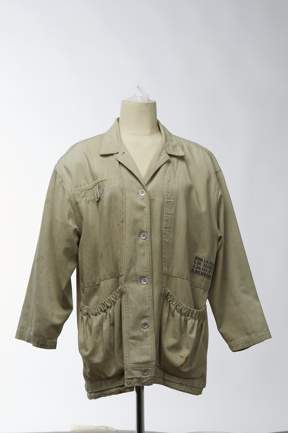 Painting coat adapted from a Stuart Membery designed jacket. It was owned and used by Mirka in her art studio in Tanner Street Richmond from the year 2000 when Mirka located there after having lived in an number of residences and studios in Melbourne CBD, Toorak, and St Kilda.