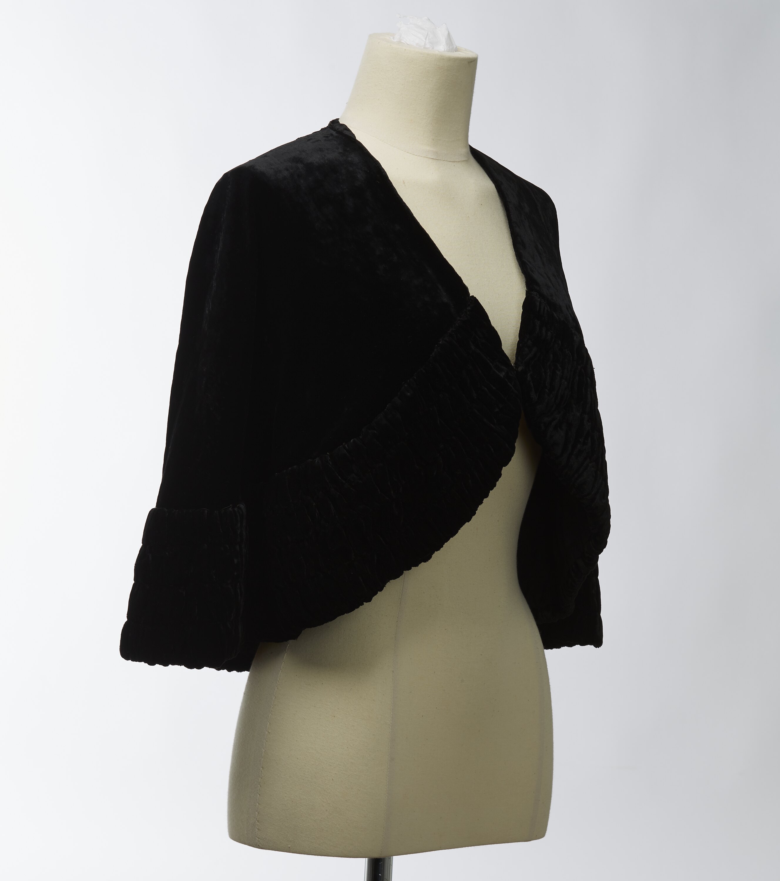 Black velvet capelet with ruched edges, metal hook and eye fastening (possibly not original) and a yellow gold and white sewn label near neckline. Capelet is lined with black satin and there is a small loop at neckline for hanging.