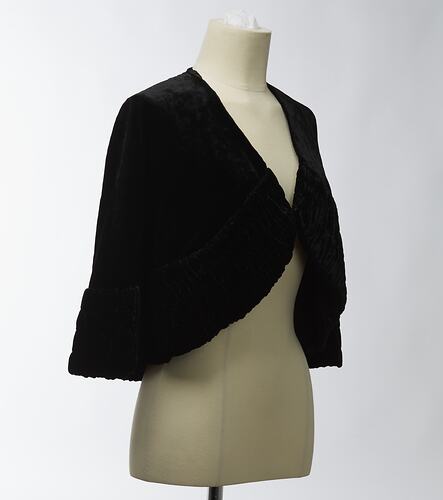 Black velvet capelet, which was owned and worn by Mirka Mora circa 1950s-1960s. The jacket displays a label for 'Georges Ladies Tailors & Outfitters' whose famous store was at Collins Street in Melbourne and its Edwardian-era style suggests that it was acquired by Mirka as a retro-style piece. She enjoyed wearing clothing from a variety of eras.
