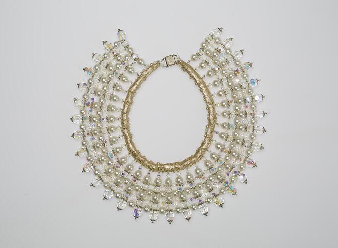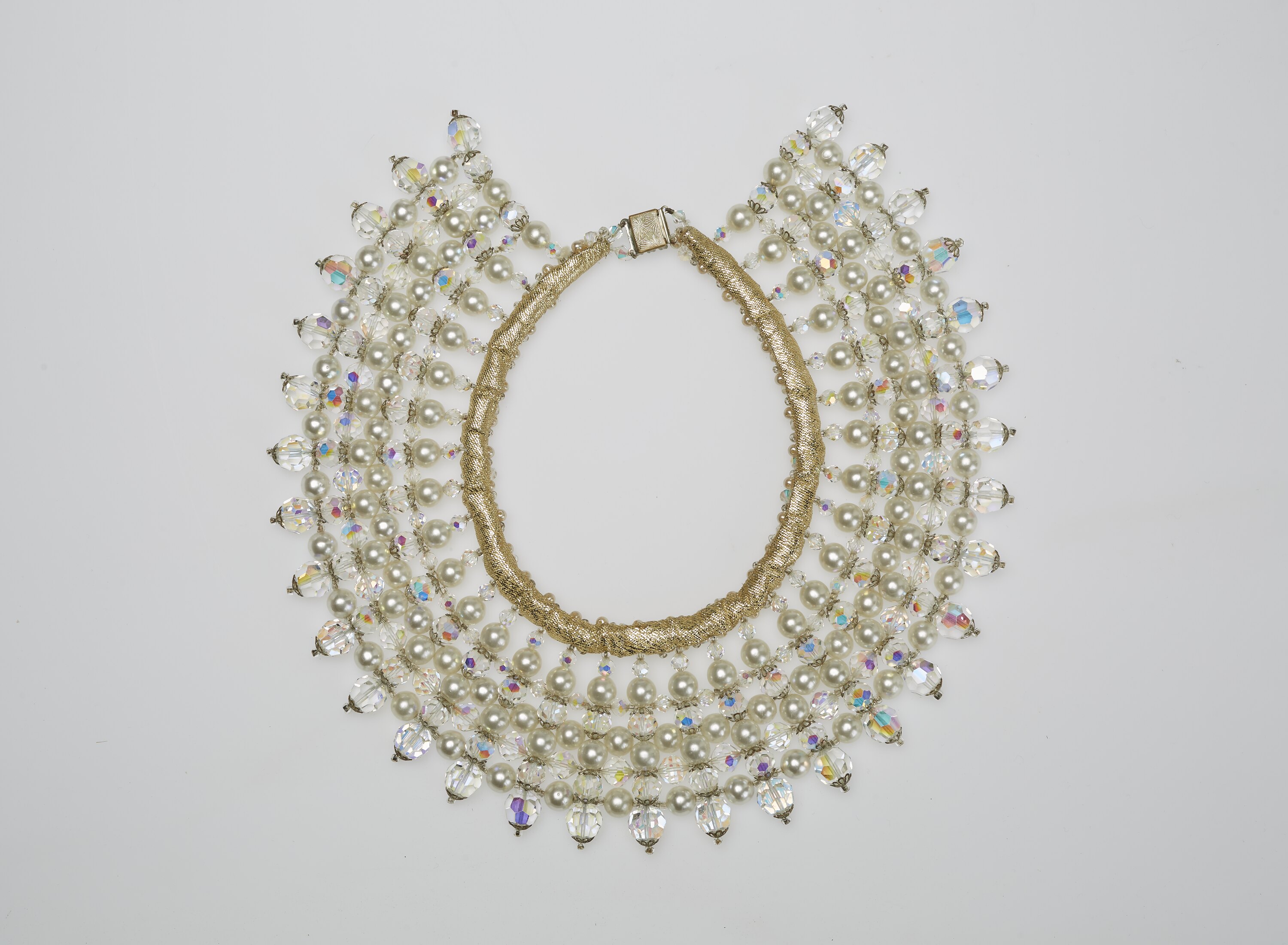 Costume jewellery collar featuring multi-tiered faux pearl and plastic beads, owned and worn by Mirka Mora from around the 1960s. Mirka's daughter-in-law Anna recalls that Mirka used to accessorise her outfits with these flashes of glamour to brighten up her early outfits when she had little money for expensive clothing.