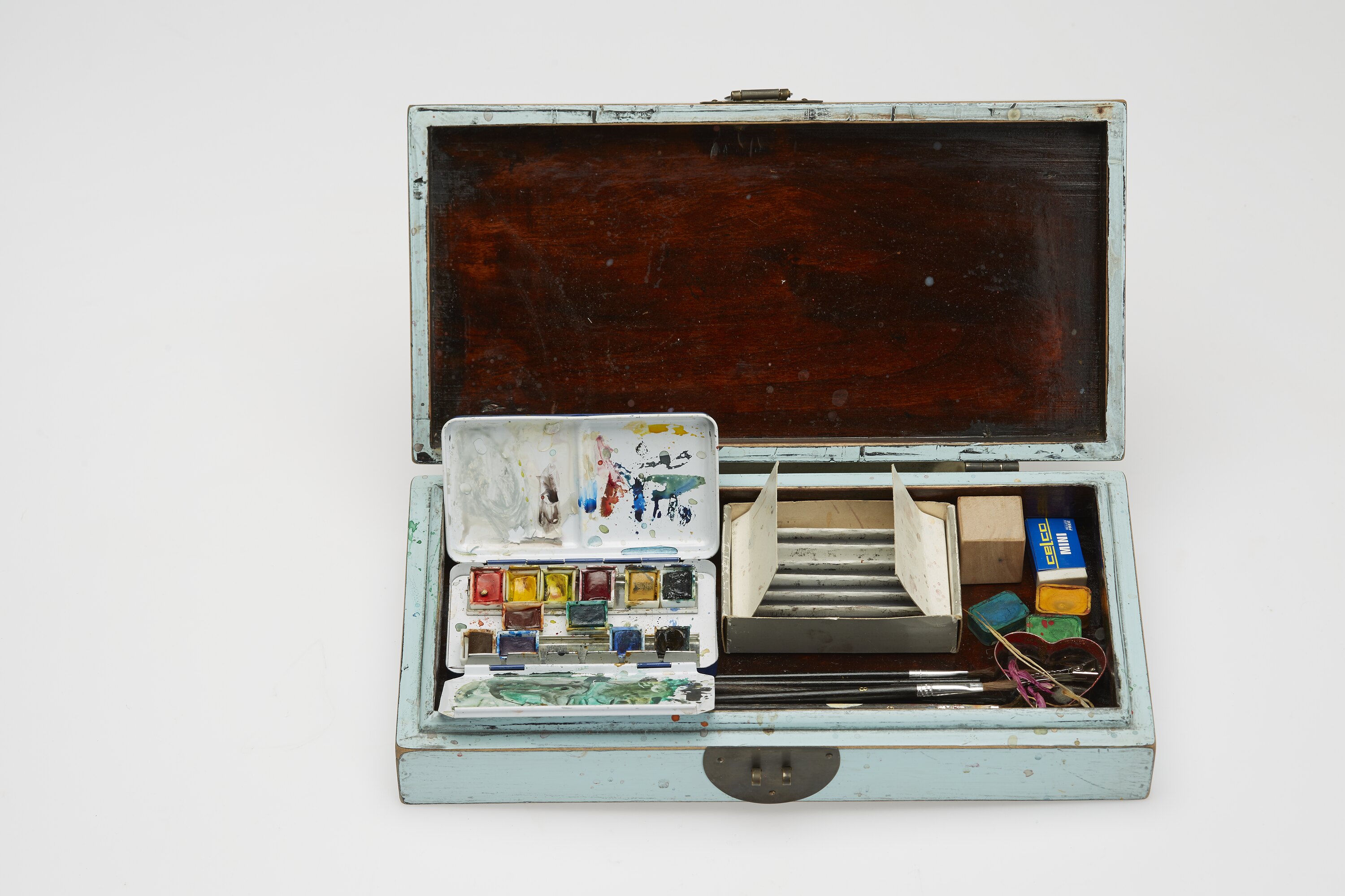 Timber box painted pale blue, with dark varnished interior. Box originally contained a box of charcoal, a Lefranc Bourgeois paint box, several loose paints, a heart-shaped biscuit cutter with red paint and gold glitter around edge, two erasers, a block of wood, a pen, a clip, and several paintbrushes.