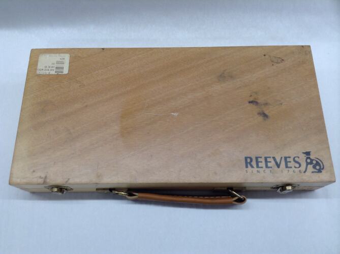 Art case owned and used by Mirka Mora in her art studio in Tanner Street Richmond from the year 2000. Mirka located there after having lived in an number of residences and studios in Melbourne CBD, Toorak, and St Kilda. The case contains painting materials and a 'Reeves' logo on the lid.