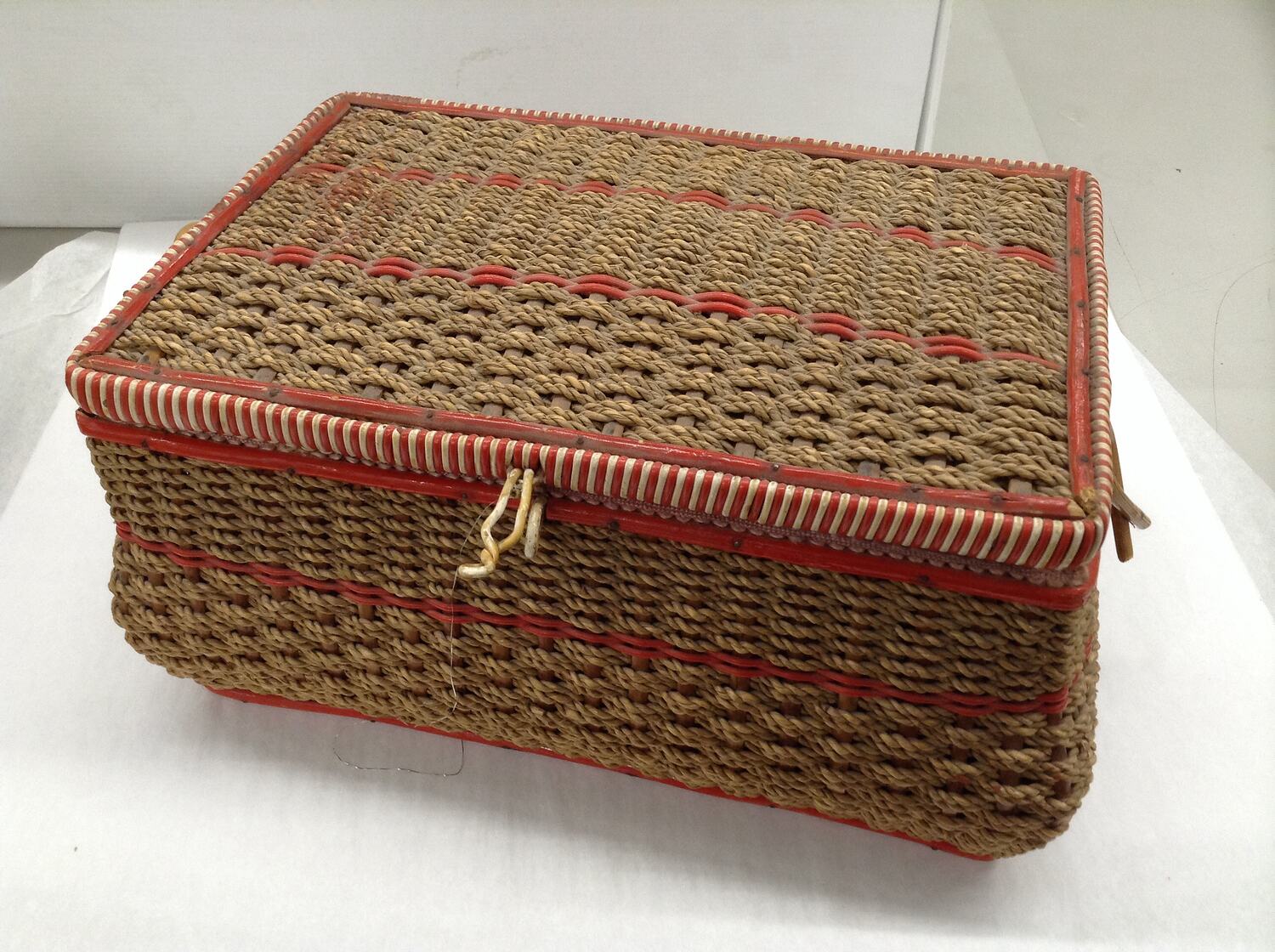 Sewing box with single pink stripe around the woven cane exterior, and double across lid. Red and white painted cane around lid and looped cane handles and fastener. Pink satin interior edged with ribbon. Lid has cushioning pinned with clear plastic buttons and the same buttons down the centre ribbon. Removable timber tray inside. Box originally contained a quilted square marked as 'Handmade by W. Enright 1991', a small wooden rod/stirrer, a skein of white wool, four lengths of ribbon, gold metal thread, 1 pack of snap fasteners, 3 labels for Herman Teddy Bears, and a spool of pale pink cotton.