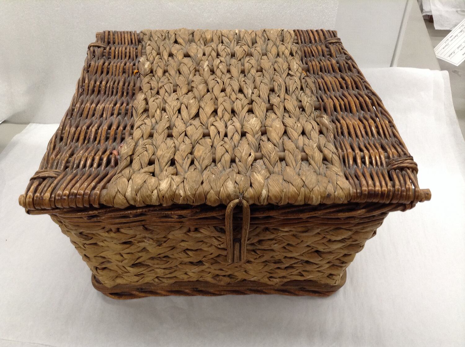 Brown rafia and cane woven basket with cane latch. Box is lined with olive green silk and ribbon in base, and a makeshift pin cushion has been sewn with scrap thread to the inner lid. Box originally contained: an antique John James & Sons needle folder containing a strip of child's drawings and a small square of lacework; a cross-stitched belt in blue and brown, several skeins of wool, loose embroidery floss, bag of green teardrop shaped beads, several spools of thread, several loose ribbons, a small embroidery sampler made of vintage ribbon and card, two pairs of scissors, a turned wooden handle, a string of white sequins, a rhinestone belt buckle and loose and packaged sewing needles and a cut-out photograph in an inner pocket.