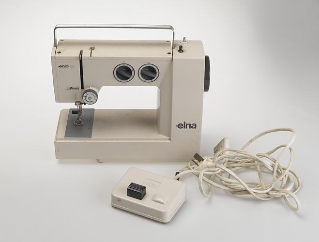 Elna table-top sewing machine owned and used by Mirka Mora in her art studio in Tanner Street Richmond from the year 2000. Mirka located there after having lived in a number of residences and studios in Melbourne CBD, Toorak, and St Kilda. One of the sewing boxes in the collection (HT55673) contained the machine's instruction manual.