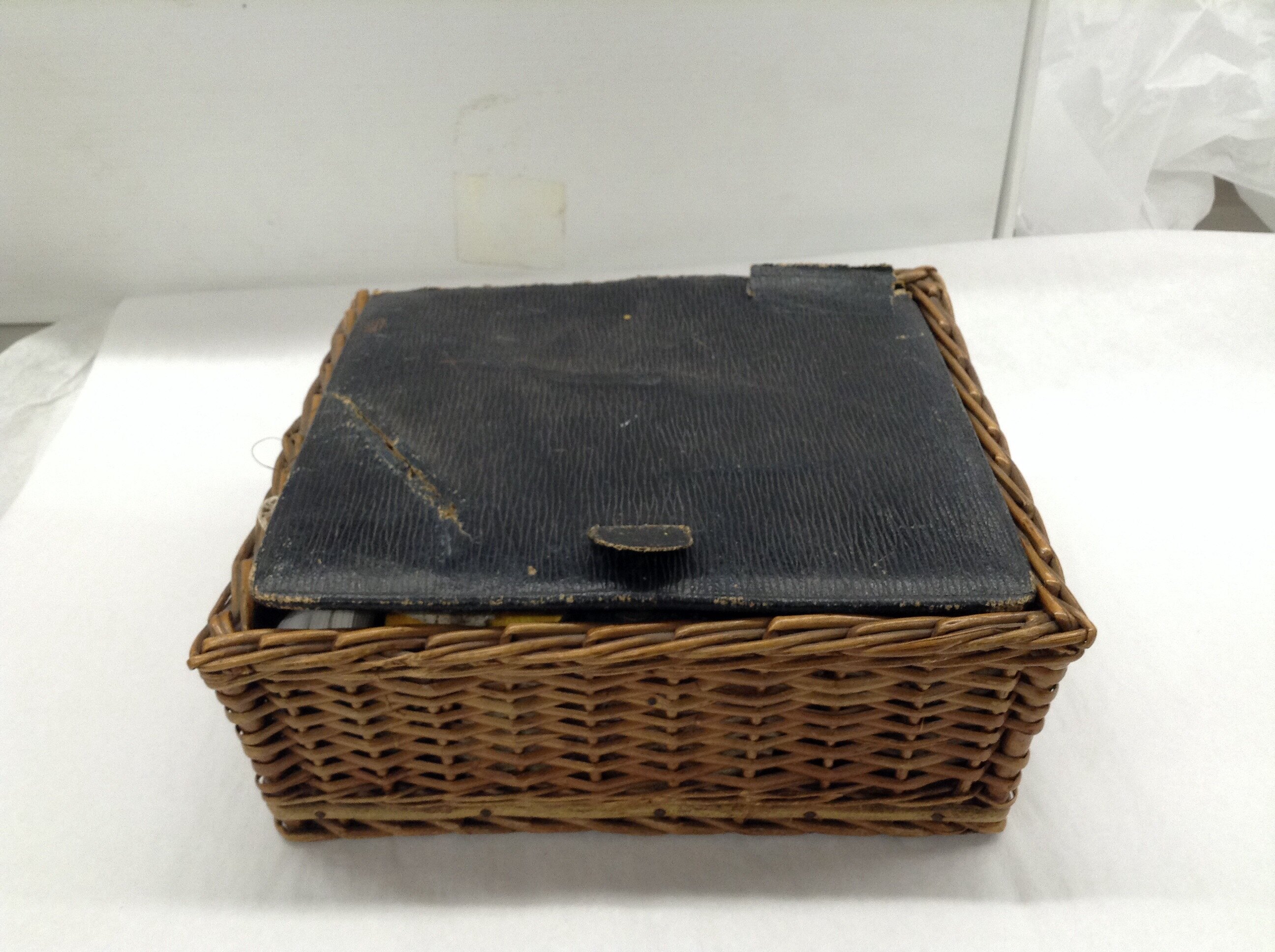 Sewing box with plain brown woven cane exterior and dark navy blue leather lid and interior lined with blue silk and ribbon. Interior has several compartments of varying sizes, and the lid is cushioned with stitched holders for materials. Some long needles are pressed through the lid. The box originally contained: various loose needles, buttons and thread, a miniature card set, a decorative silver plated crochet hook with ornate engraved handle, several bobbins of coloured thread, several lengths of lace, embroidery floss, loose buttons (including one metal button with engraved flower, one crocheted navy blue button, and a dark red glass bead), several packs of sewing needles, a pack of snap fasteners, several lengths of elastic, a broken black wooden piece with Asian script engraved on it, pencils, and several skeins of embroidery floss.