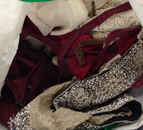 Woolworths bag containing a bundle of fabric and clothing scraps.