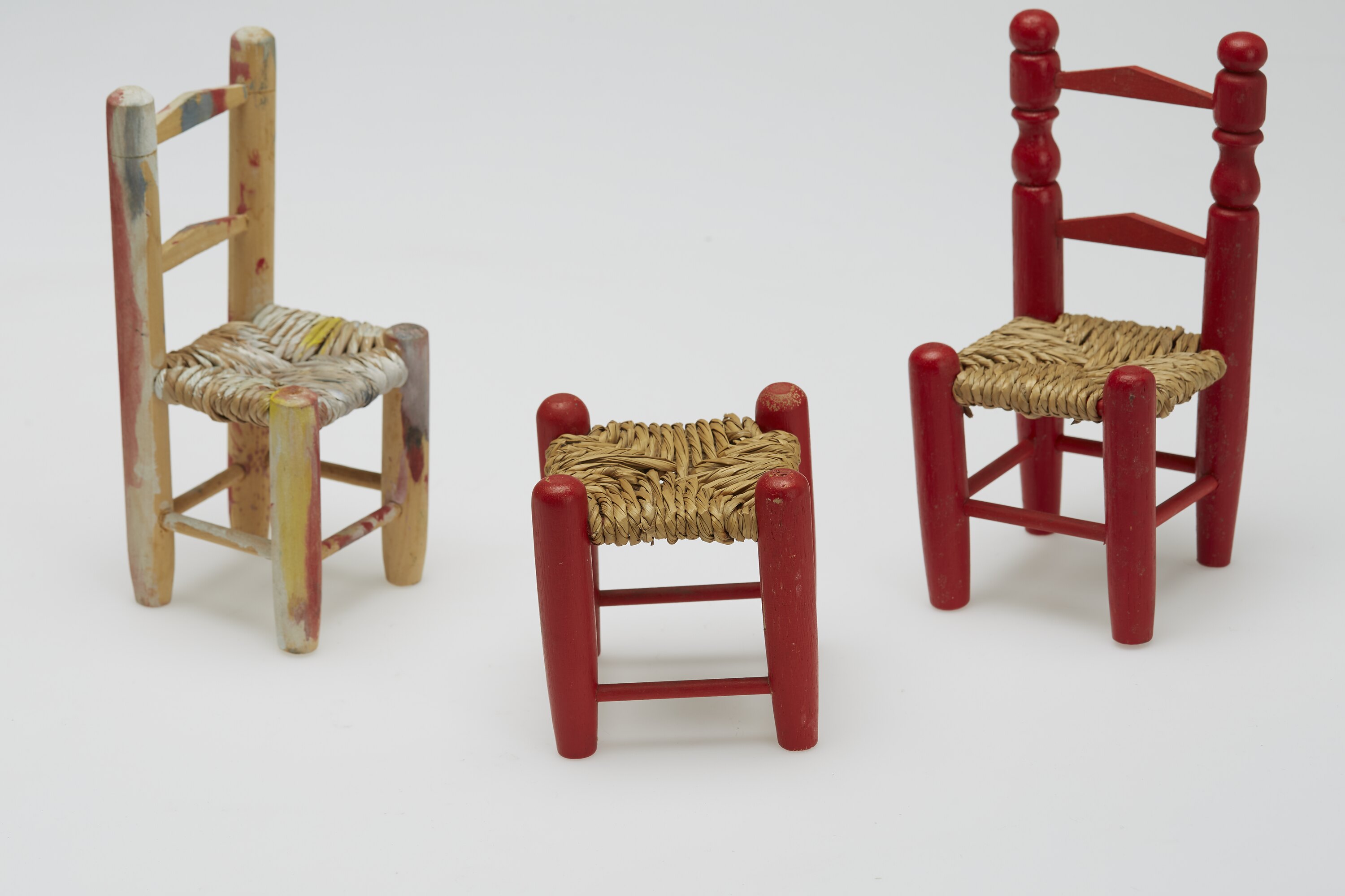 Collection of six miniature furniture pieces, which were owned and used by Mirka Mora in her art studio in Tanner Street Richmond from the year 2000. Mirka located there after having lived in a number of residences and studios in Melbourne CBD, Toorak, and St Kilda. These items were part of a group of small dolls, prams and furniture stored in a timber wine box (HT 55702). There are four high-backed wooden chairs and two stools with raffia seats.