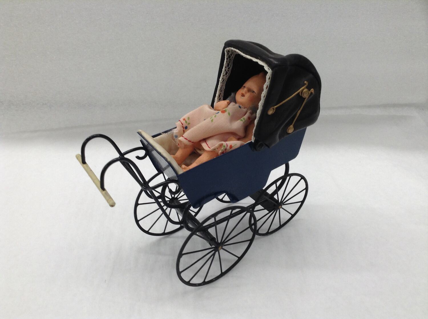 Painted black metal miniature pram with white handle and black leather hood. Interior is lined with white padded satin. The pram originally contained a small doll wearing a pink floral dress. The doll has an open mouth and movable arms to suck her thumb. The doll has pale pink skin and painted hair.