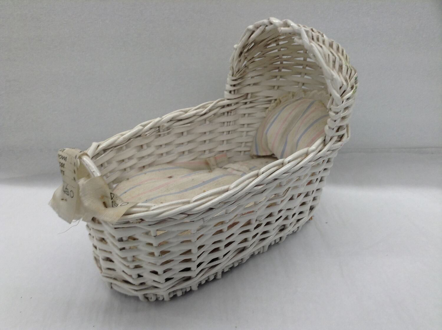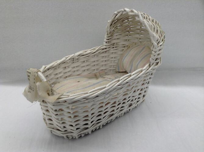 A miniature white, woven bassinet which was owned and used by Mirka Mora in her art studio in Tanner Street Richmond from the year 2000. Mirka located there after having lived in an number of residences and studios in Melbourne CBD, Toorak, and St Kilda. This item was part of a group of small dolls, prams and furniture stored in a timber wine box (HT 55702).