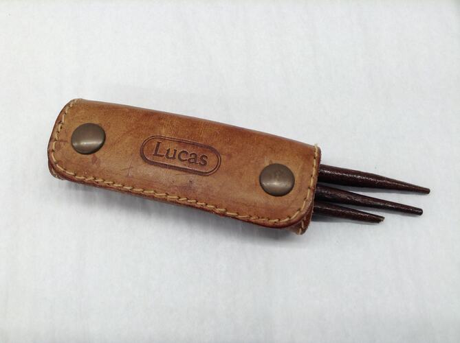 Brown leather 'Lucas' sheath with two Fiocchi studs containing three turned wooden sticks (paintbrush handles or doll furniture parts). It was owned and used by Mirka Mora in her art studio in Tanner Street Richmond from the year 2000. Mirka located there after having lived in a number of residences and studios in Melbourne CBD, Toorak, and St Kilda. These items were part of a group of small dolls, prams and furniture stored in a timber wine box (HT 55702).