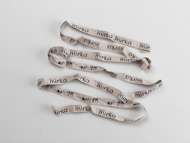 Long ribbon of uncut cloth labels (black type on white background) with the repeated words 'Made by mirka'. The labels were stored in one of Mirka's sewing boxes which also stored a variety of sewing materials, and an unfinished cloth artwork.