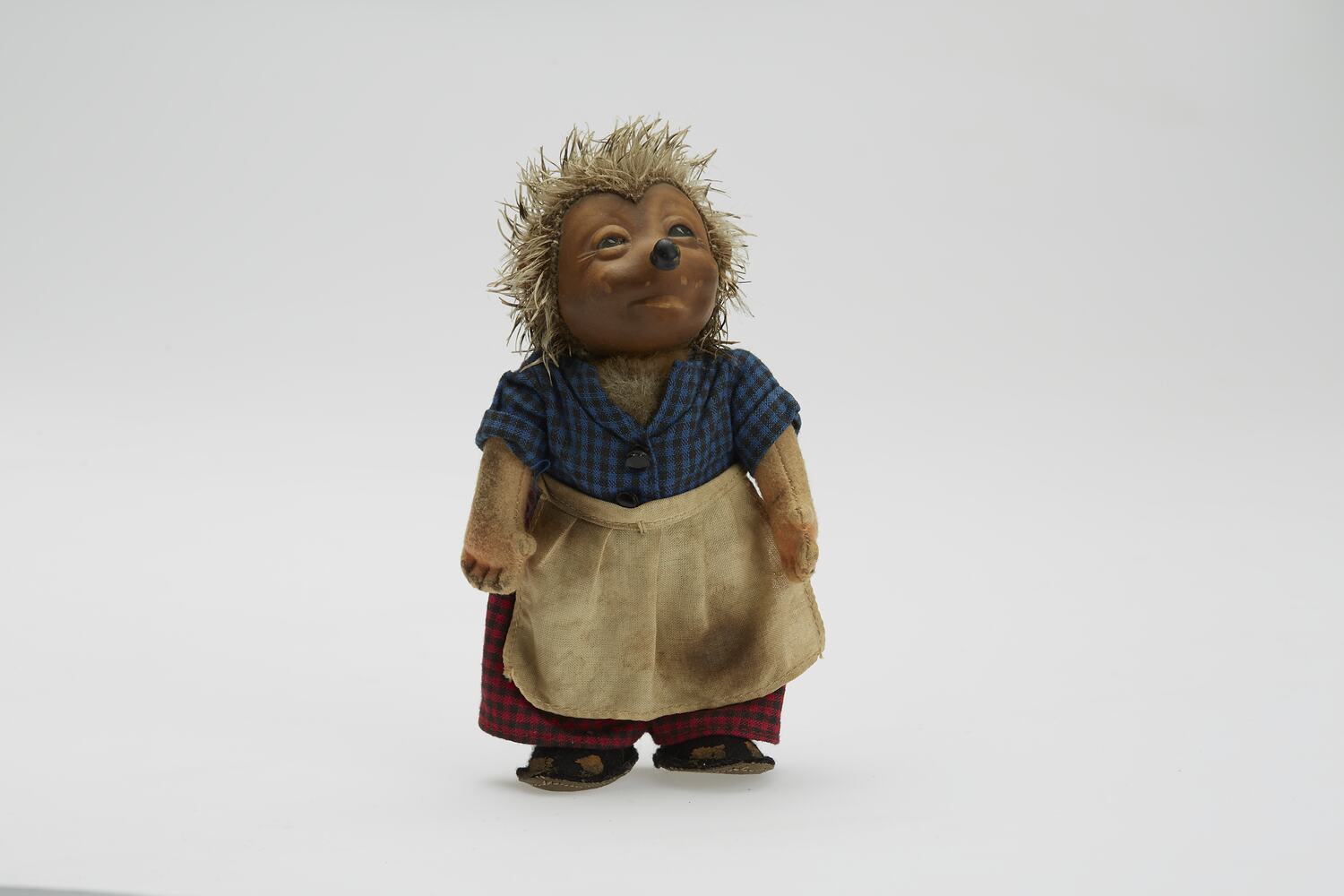 Hedgehog doll in female dress, originally seated on a miniature wooden rocking chair. It was owned and used by Mirka Mora in her art studio in Tanner Street Richmond from the year 2000 when Mirka located there after having lived in an number of residences and studios in Melbourne cbd, Toorak, and St Kilda. These items were part of a group of small dolls, prams and furniture stored in a timber wine box. The hedgehog was positioned on the rocking chair when acquired by the Museum but it is not clear whether this was done by Mirka herself.