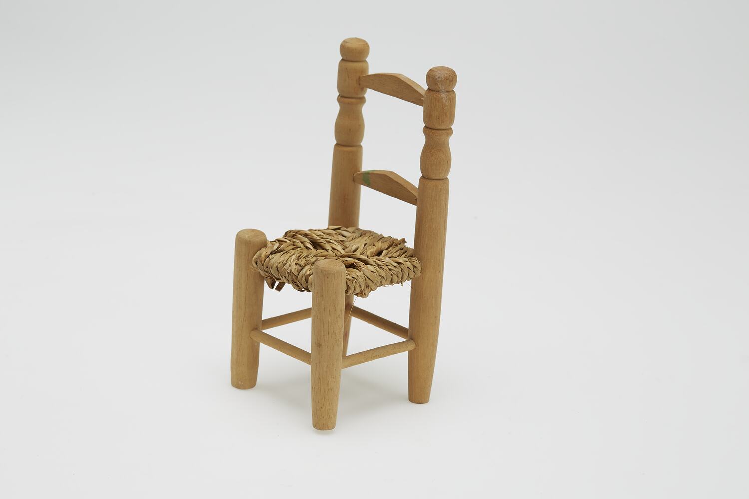 Wooden chair, one of a collection of six miniature furniture pieces, which were owned and used by Mirka in her art studio in Tanner Street Richmond from the year 2000 when Mirka located there after having lived in an number of residences and studios in Melbourne cbd, Toorak, and St Kilda. These items were part of a group of small dolls, prams and furniture stored in a timber wine box.