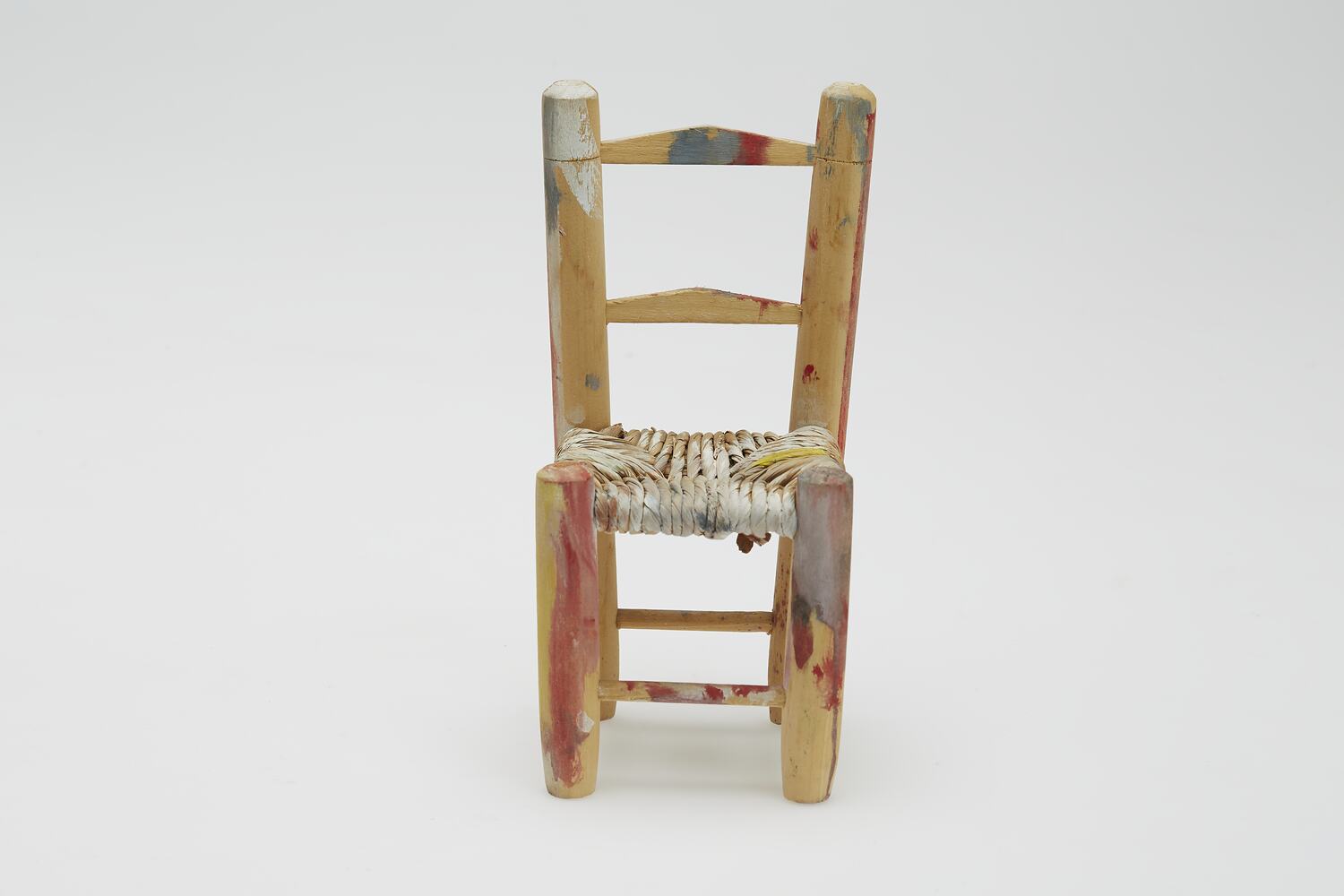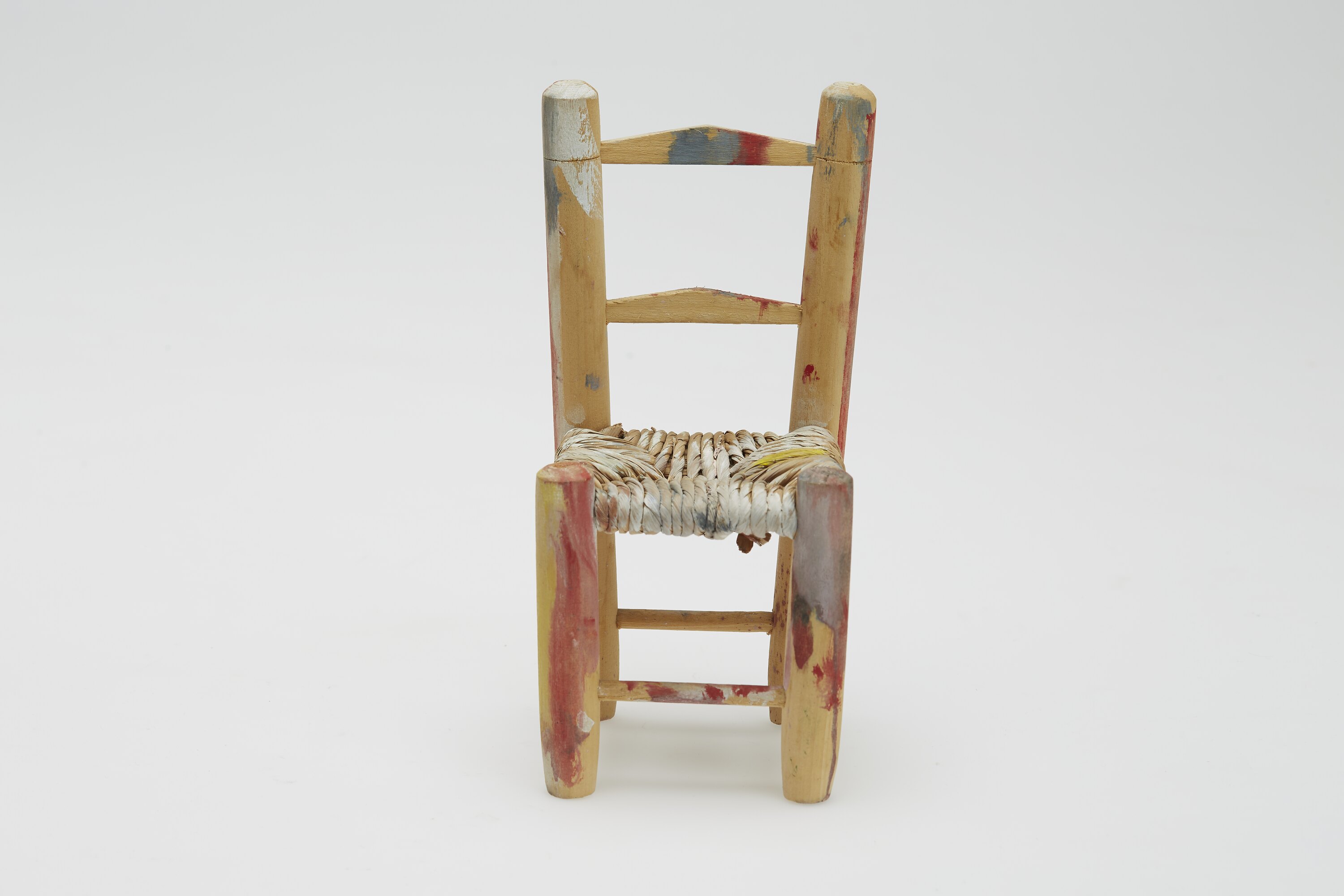 Miniature turned wood chair with raffia seat. Has paint splashes and roughly painted sections in multiple colours.