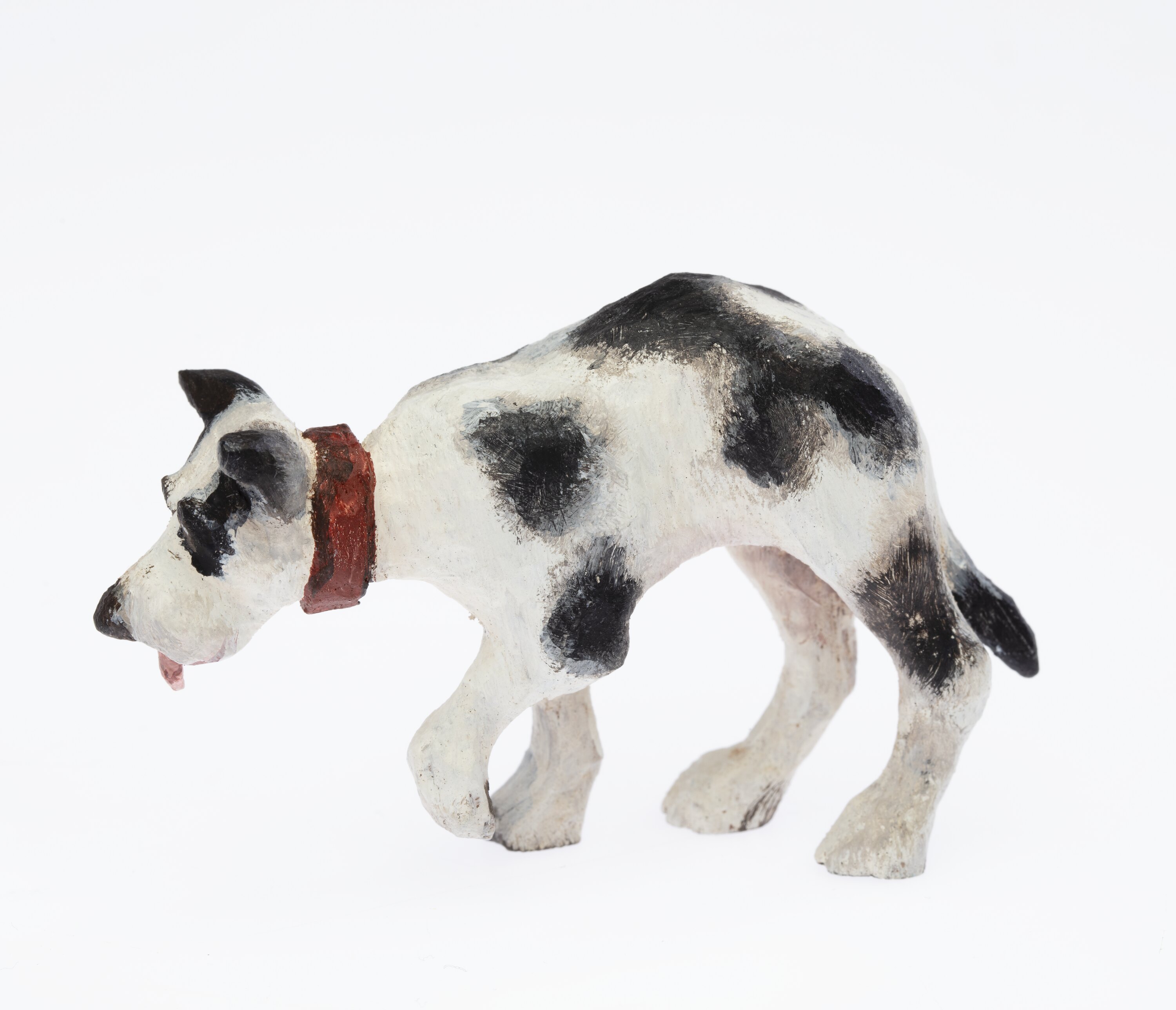 Miniature dog figurine. The dog is white with black spots and a red collar. Its tongue is poking out.