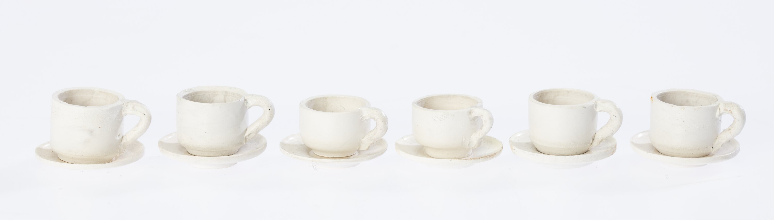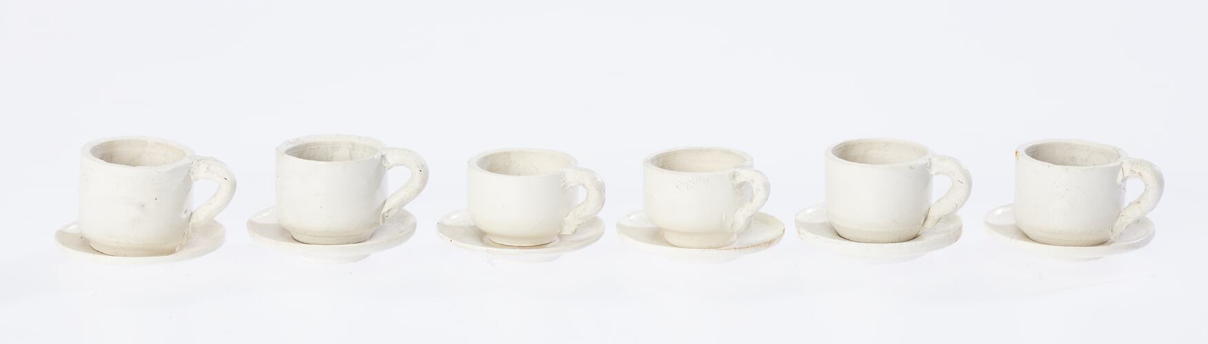Set of miniature cups and saucers in white. There are six separate cups and six separate saucers.