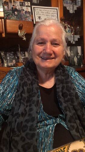 Colour digital photograph of Aphroditi Pandazi (nee Selingouna) taken in Melbourne, circa 2018. The photograph relates to the rug and hall runner woven by Aphroditi in Kalohori and acquired by the Museum in 1995. The rug was woven by Aphroditi Selingouna Pandazi when she was 16 years old in her village of Kalohori.