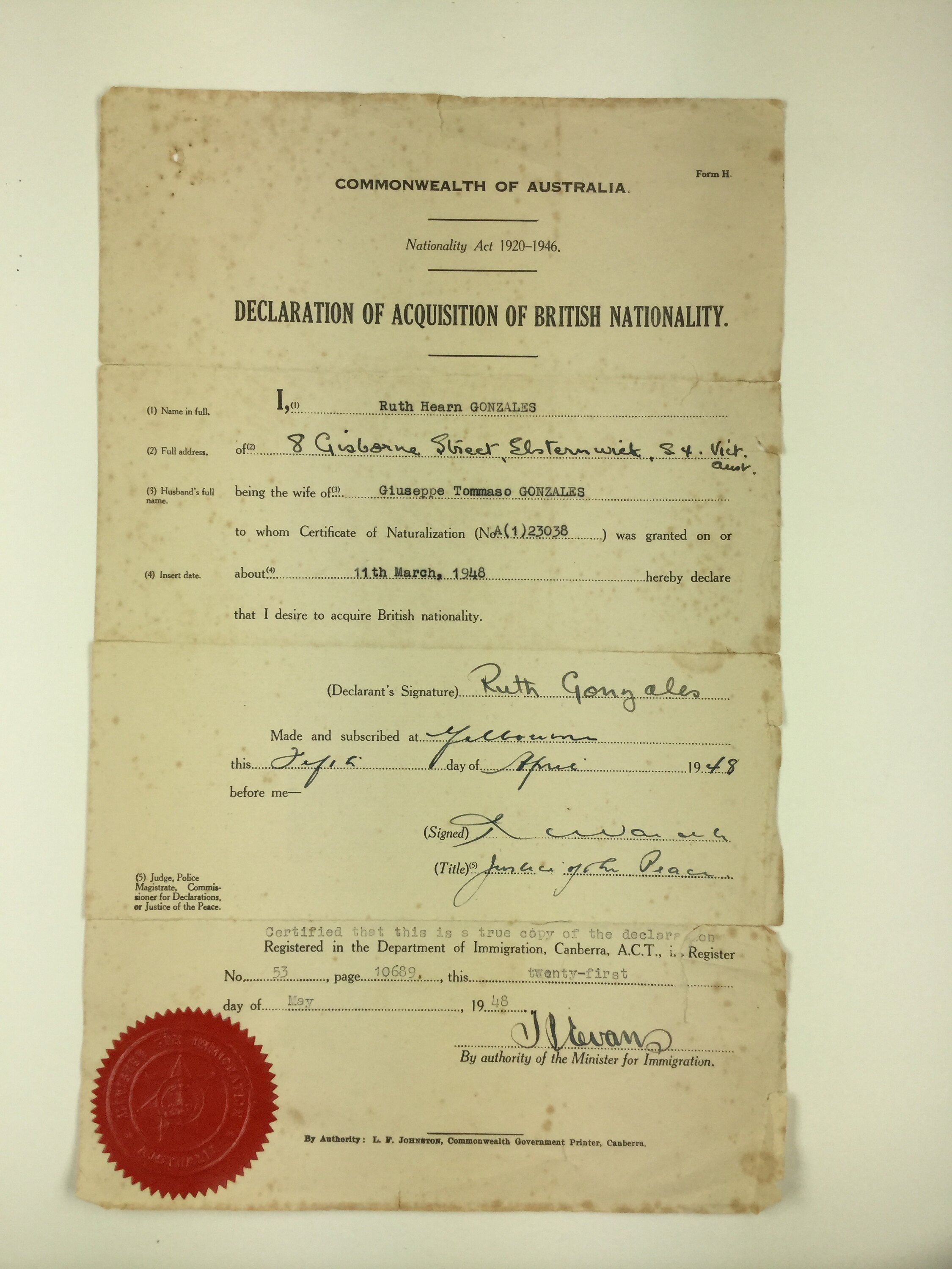 Ruth had married Giuseppe Gonzales in Kew in 1946. Giuseppe had been interned as an Italian enemy alien on arrival in Australia in 1940. Giuseppe met future wife Bobbie on a ship sailing from Italy to Australia in 1940. Giuseppe was arrested upon arrival and interned as an enemy alien until 1946 when he could finally marry Bobbie - who lost her Australian citizenship as a result.