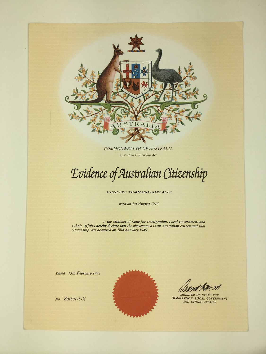Certificate of Evidence of Australian Citizenship, Giuseppe Gonzales, Commonwealth of Australia, 13 Feb 1992. Giuseppe had been interned as an Italian enemy alien on arrival in Australia in 1940. Giuseppe met future wife Bobbie on a ship sailing from Italy to Australia in 1940. Giuseppe was arrested upon arrival and interned as an enemy alien until 1946 when he could finally marry Bobbie in Kew in 1946 - who lost her Australian citizenship as a result.