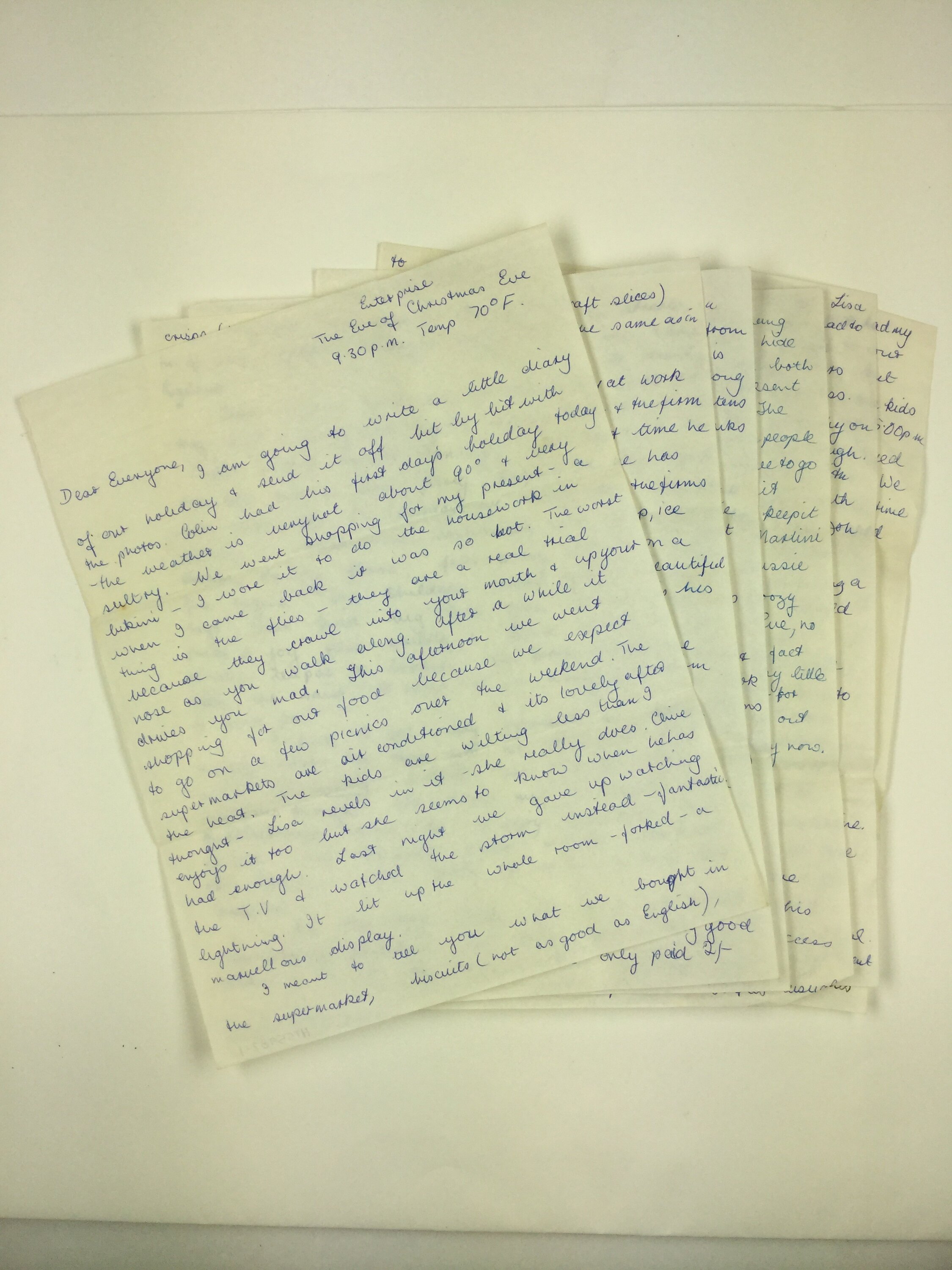 Letter (one of two letters) handwritten by Jean Austin to her family back in England, soon after arriving in Melbourne in 1971. This letter describes impressions and experiences at the time of their first Christmas in Austalia at the Enterprise Hostel in Springvale. Another letter (HT55986) was written from Eastbridge Migrant Hostel on the day after their arrival and describes in great detail the experience of departing and flying to Australia;