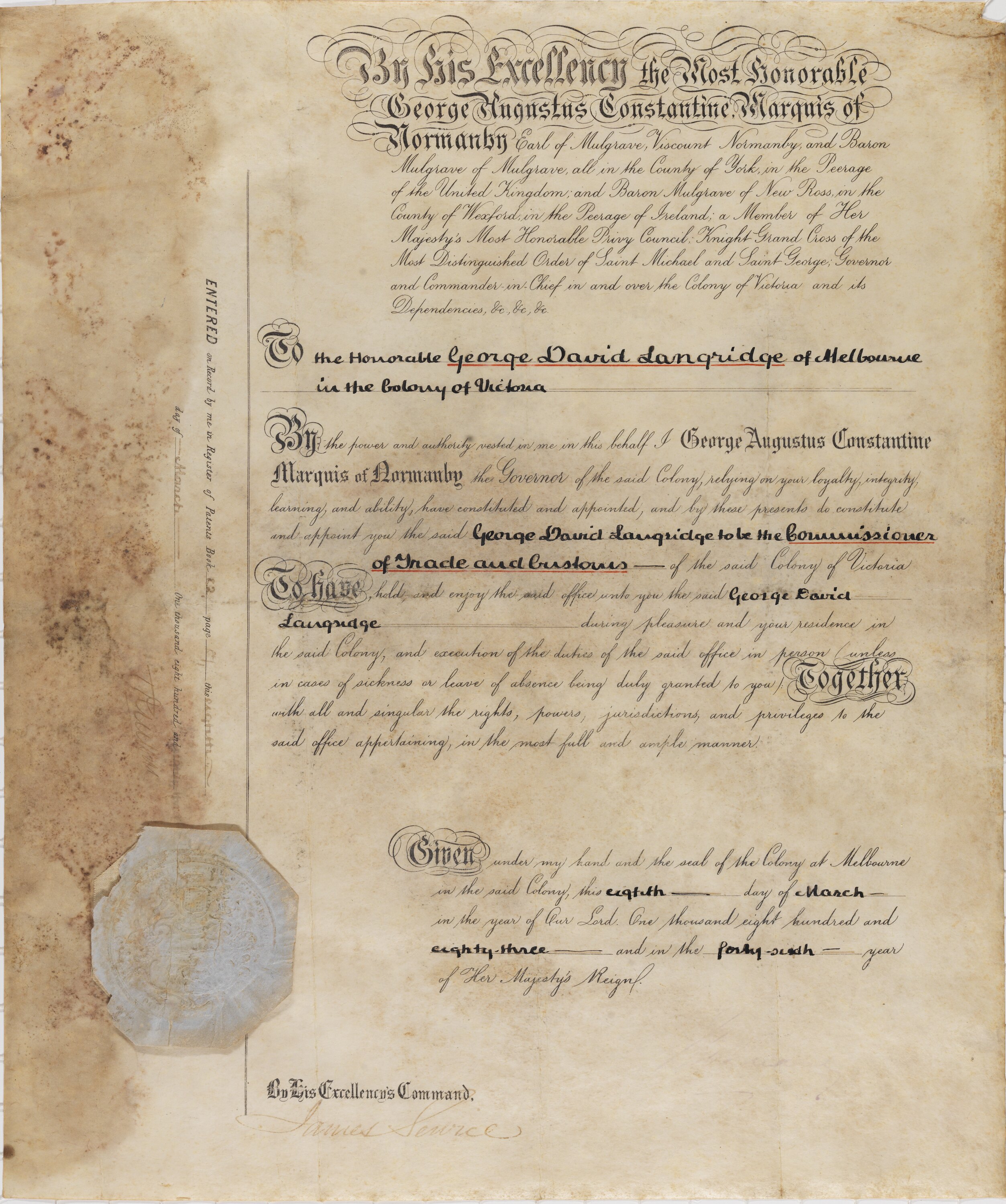 Parchment certificate documenting the appointment of George David Langridge to the position of Comissioner of Trades & Customs, 8 March 1883.