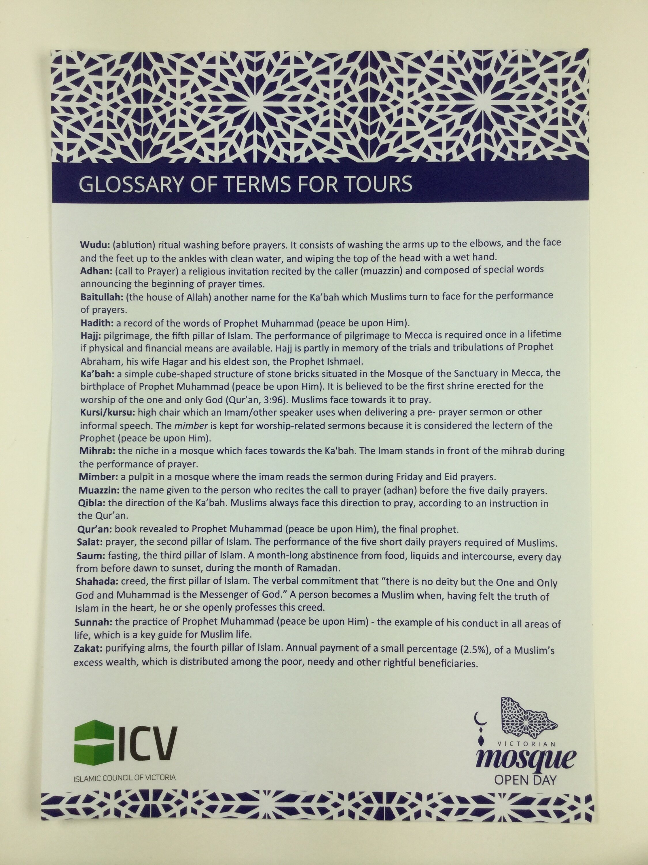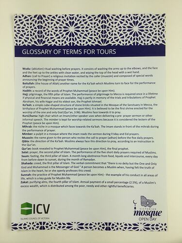 Flyer entitled: 'Glossary of Terms for Tours', one of ten publications contained in a blue cloth bag with a logo of Victoria and 'Victorian Mosque Open Day' embossed on the front.