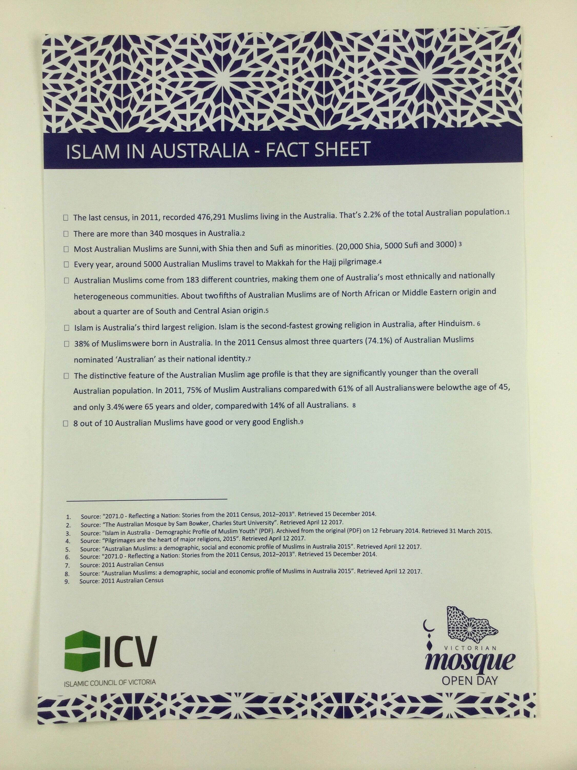 Flyer entitled: 'Islam in Australia-Fact Sheet', one of ten publications contained in a blue cloth bag with a logo of Victoria and 'Victorian Mosque Open Day' embossed on the front.