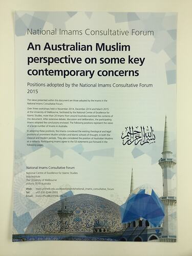 Flyer entitled: 'National Imams Consultative Forum. An Australian Muslim Perspective on Some Key Contemporary Concerns' (2015), one of ten publications contained in a blue cloth bag with a logo of Victoria and 'Victorian Mosque Open Day' embossed on the front.