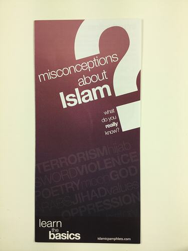Brochure entitled: 'Misconceptions About Islam', one of ten publications contained in a blue cloth bag with a logo of Victoria and 'Victorian Mosque Open Day' embossed on the front.