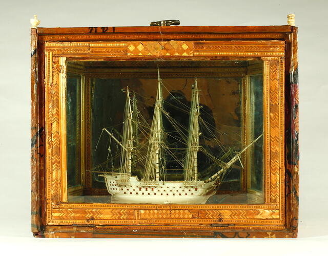 Case for three decked Man-O-War model. Possibly of French design. Model is believed to have been made by a French prisoner of war captured at the Battle of the Nile in 1798. Model is apparently made from beef bone and the case is decorated with straw marquetry. This model was purchased by the Museum in 1926.