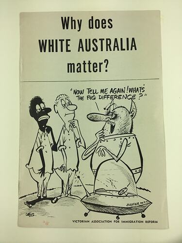 Pamphlet entitled 'Why Does White Australia Matter?', published by the Victorian Association for Immigration Reform, Melbourne, circa 1968. It is one of three duplicate copies which make the case for the end of the White Australia policy and expound the arguments laid out in the the Immigration Reform Group's seminal work 'Immigration Control or Colour Bar?' published in 1960. The pamphlet features an evocative cartoon of a martian standing in front of two men with black and white skin asking 'Now tell me again! What's the Difference?' The Association had branches in Victoria, New South Wales, South Australia, Western Australia and the ACT.