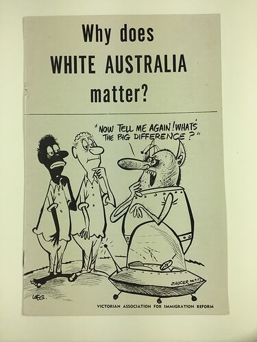 Pamphlet entitled 'Why Does White Australia Matter?', published by the Victorian Association for Immigration Reform, Melbourne, circa 1968. It is one of three duplicate copies which make the case for the end of the White Australia policy and expound the arguments laid out in the the Immigration Reform Group's seminal work 'Immigration Control or Colour Bar?' published in 1960. The pamphlet features an evocative cartoon of a martian standing in front of two men with black and white skin asking 'Now tell me again! What's the Difference?' The Association had branches in Victoria, New South Wales, South Australia, Western Australia and the ACT.